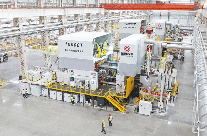 湖北日报讯(记者左晨,致信王宜林、王敏)720℃的铝液已被准确地注入模具中。经过合模、加压、冷却、脱模等一系列工序,仅用两分钟就成型了长约2.1米、宽1.6米、重约60公斤的新能源电池托盘。 10月21日,全球最大的综合压铸工厂——东风汽车万吨级综合压铸工厂正式进入调试生产阶段。