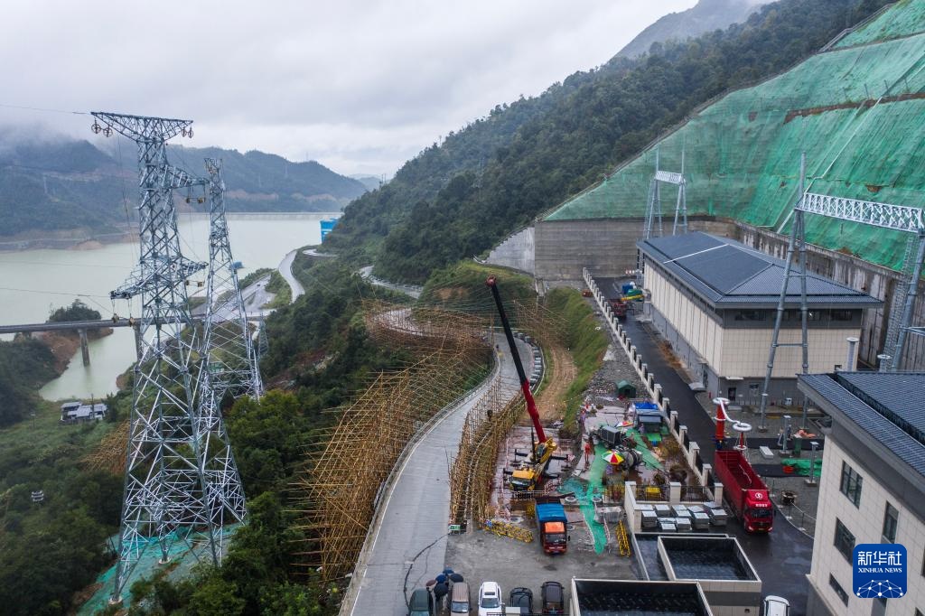 9月23日,在省会Tintai泵送储存电站的开关站,建筑工人为500 kV传输项目建造了送货线(无人机
